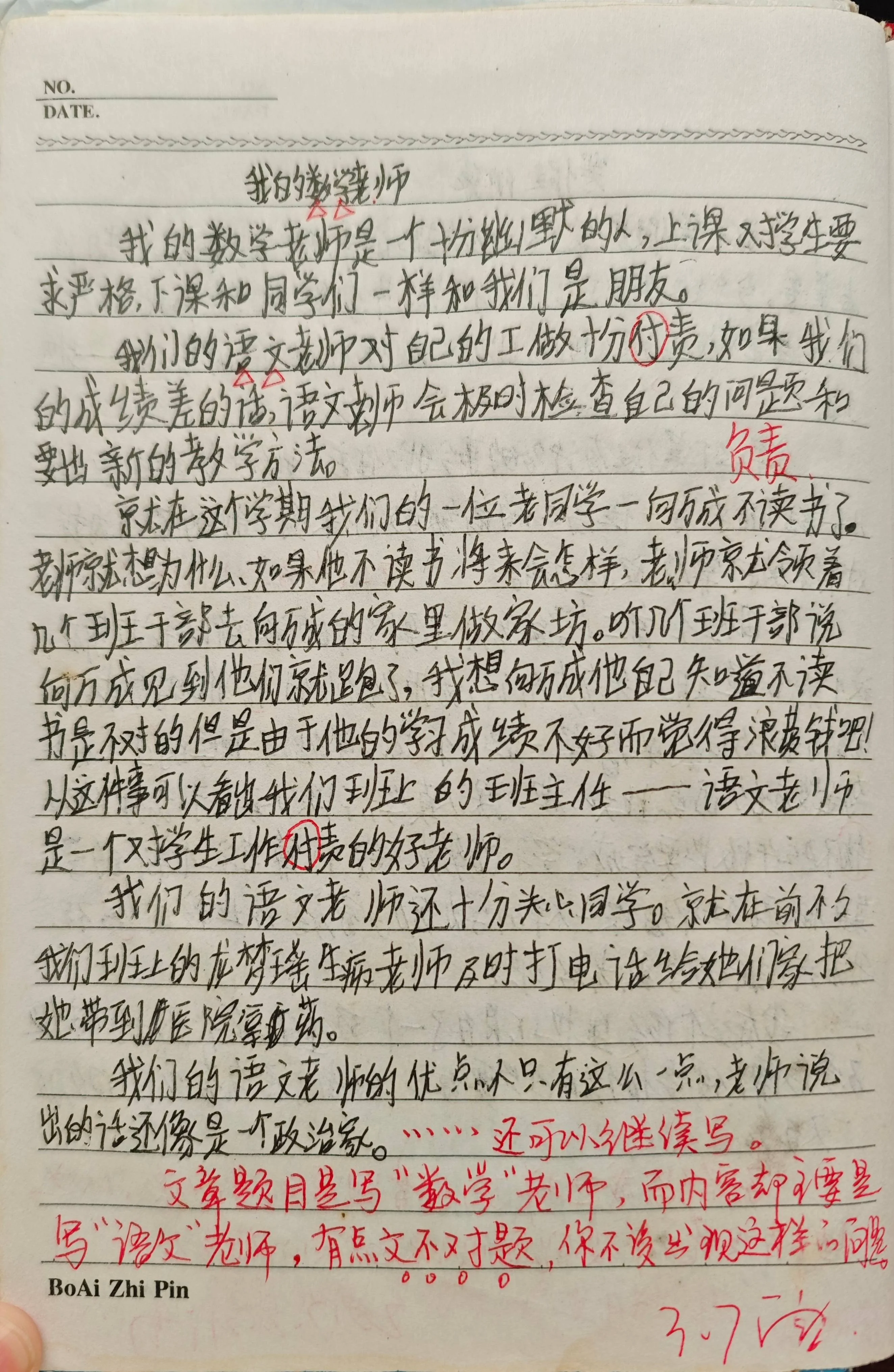 此篇作文来自博主初中时候;批改日期:3月7日,具体年代无从得知。