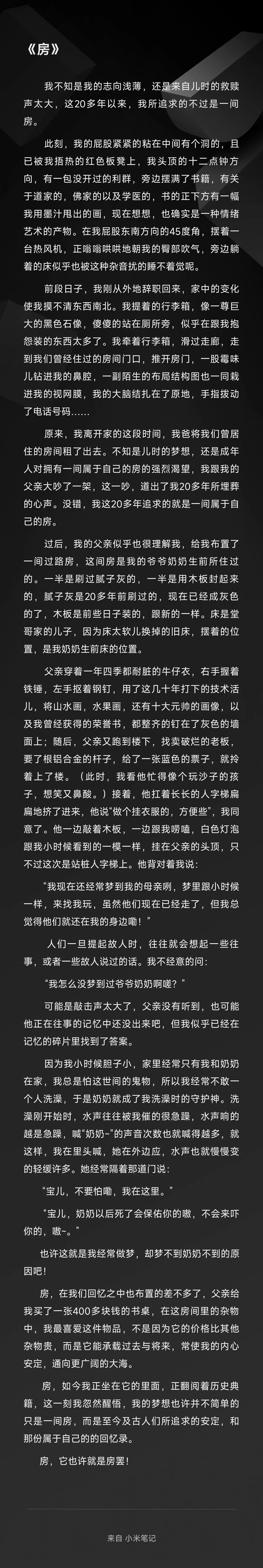 房,如今我正坐在它的里面,正翻阅着历史典籍,这一刻我忽然醒悟,我的梦想也许并不简单的只是一间房,而是至今及古人们所追求的安定,和那份属于自己的的回忆录。