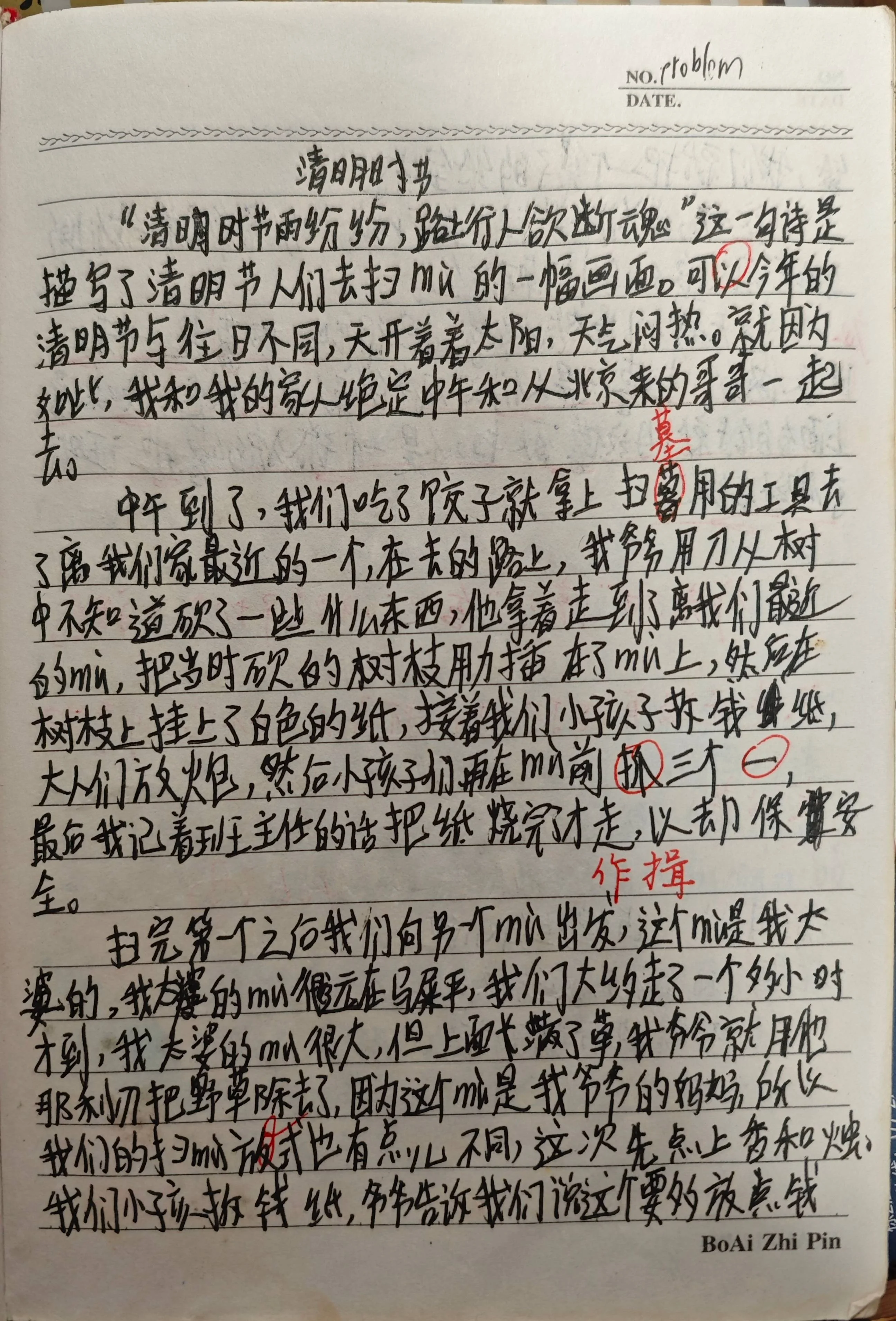 教师批语:作者对“清明”含义的理解切合了主题,只是还没有能把对已逝亲人的怀念之情抒发出来。